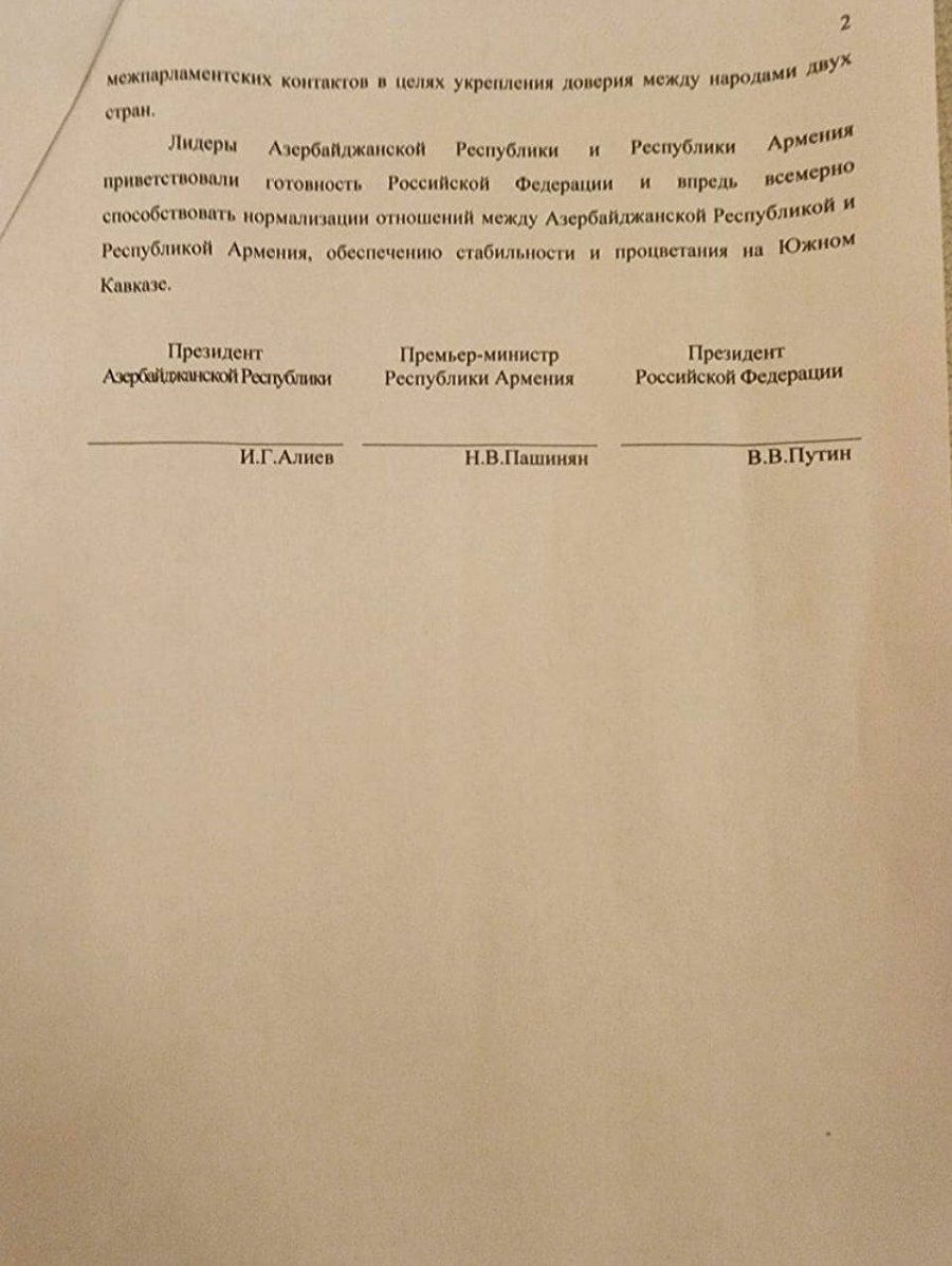 Ադրբեջանի Հանրապետության և Հայաստանի Հանրապետության ղեկավարները ողջունել են Ռուսաստանի Դաշնության պատրաստակամությունը՝ շարունակելու ամեն կերպ նպաստել Ադրբեջանի Հանրապետության և Հայաստանի Հանրապետության միջև հարաբերությունների կարգավորմանը՝ Հարավային Կովկասում կայունություն և բարգավաճում ապահովելու համար»,-ասված է համատեղ հայտարարության մեջ։