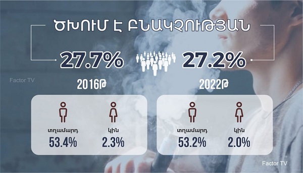 Հայաստանում ծխում է բնակչության շուրջ 1/3-ը, և այս թիվը տարիներ շարունակ կայուն պահպանվում է։ Ծխելու դեմ անողոք պայքար հայտարարած Հայաստանում ծխախոտի օգտագործման ցուցանիշները պարզելու նպատակով ընտրանքային հետազոտություն իրականացվել է 3 տարի առաջ՝ 2022 թվականին։ Ըստ այդմ՝ մեր երկրում ծխում է բնակչության 27․2%-ը, ծխողների 53․2 %-ը տղամարդիկ են, 2․0 %-ը՝ կանայք։ Այս իրավիճակը 2016-ի համեմատ շատ չի փոփոխվել․ այդ ժամանակ կատարված նույն հետազոտության համաձայն՝ ծխախոտային արտադրանք կամ փոխարինիչ օգտագործել է բնակչության 27․7%-ը, որից 53․4%-ը՝ տղամարդիկ, իսկ 2․3%-ը՝ կանայք։ Էլեկտրոնային ծխախոտ (վեյփ) օգտագործում է ամեն օր ծխողների 3.3%-ը, իսկ տաքացվող ծխախոտ՝ 3 %-ը։